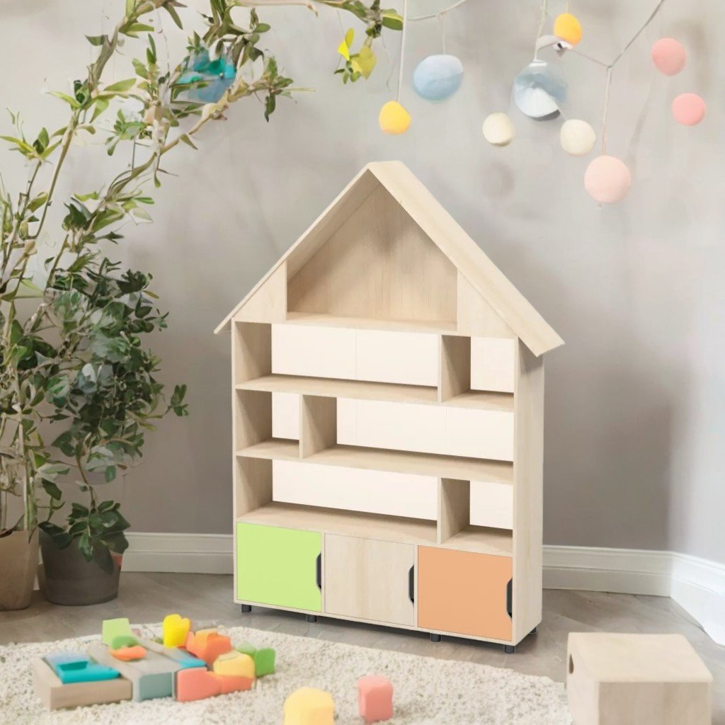 Този шкаф с размери 1500x380x2275 мм е изработен от 16 мм ламинирано ПДЧ, а гърбът е от 3 мм бял ламиниран HDF, което гарантира стабилност и издръжливост. Има специална форма, вдъхновена от къща, и има 4 отворени рафта заедно с отделения с различни размери. Долната част включва затворени клетки с цветни врати, които имат заоблени ъгли и специални изрези за лесно отваряне. Мебелите се сглобяват със сигурни закопчалки, а фронтовете са във весели нюанси: занаятчийска перла, портокал, портокал и лайм. Продуктът се ползва с 24 месеца гаранция. Направете заявка до ChatGPT