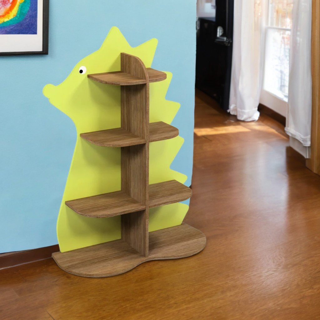 Цветът на рафтовете е градски дъб кафяв, а задната стена, която оформя силуета на таралежа, е боядисана в жив нюанс на лайм.