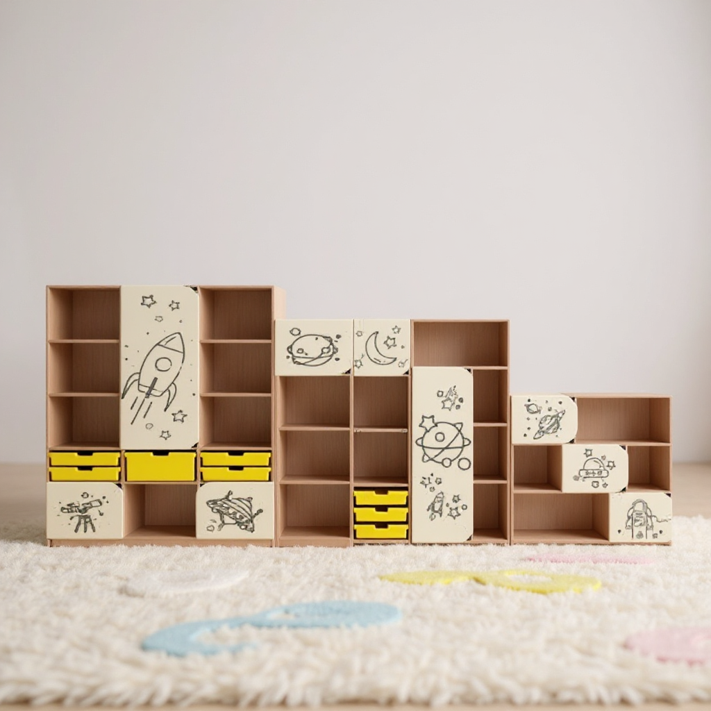 Комплектът е с размери 3296 × 400 × 1600 мм и е изработен от ЛПДЧ с дебелина 16 мм, а задната стена е от 3 мм бял меламин PFL. Фасадите са завършени с ABS кант 1мм, а вътрешните с ABS кант 0,5мм. Състои се от 5 шкафа с отворени и затворени рафтове, комплектът включва и пластмасови кутии, монтирани на водачи: 7 бр.312×377×75 мм, 1 бр.312×377×150 мм и 1 бр.525×470×43 мм. Вратите на шкафа са заоблени, снабдени с вдлъбнатини за отваряне и декорирани с тематичен фотопечат (ракети, звезди, луна, телескоп, астронавт, сателит), защитени с нетоксичен акрилен лак на водна основа. Всички елементи са сглобени с безопасен и скрит обков и са предназначени за стенен монтаж. Обшивката е светъл дъб, а фасадите са бежови. Гаранция: 24 месеца.