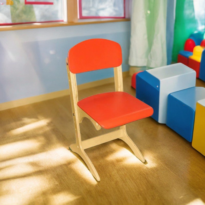 Облегалката и седалката са изработени от боядисан шперплат, леко извит, с дебелина 8 мм, завършен с нетоксична акрилна боя на водна основа. Краката са изработени от 15 мм полиран шперплат, покрити с екологичен акрилен лак. Всички компоненти са закрепени с винтове с вътрешен ключ и скрити гайки за максимална сигурност. Налични цветове: жълт, червен, син, зелен. Размери: 332×390×(542–622) mm | Тегло: 2,3 кг