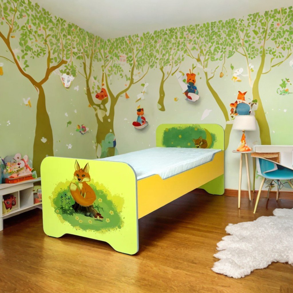 Детско легло със заоблени страни с размери 1432 х 634 х 615 мм и тегло 19 кг. Подматрачната опора е с размери 1400 х 600 мм. Леглото е изработено от меламиново ПДЧ с дебелина 16 мм с 1 мм сребрист ABS кант, а подматрачната опора е от шперплат с дебелина 7 мм. Горният корпус е изработен от 12 мм шперплат. Страните и предната част са заоблени, декоративни и гладки, а страните са покрити с водоустойчив фотопечат с изображение на лисица. Дъното на рамката е снабдено с издръжливи пластмасови уплътнения. Всички компоненти са сглобени със скрити и сигурни крепежни елементи. Цветът на леглото е комбинация от лайм зелено и жълто. Продуктът се продава без матрака и е с 12 месеца гаранция.