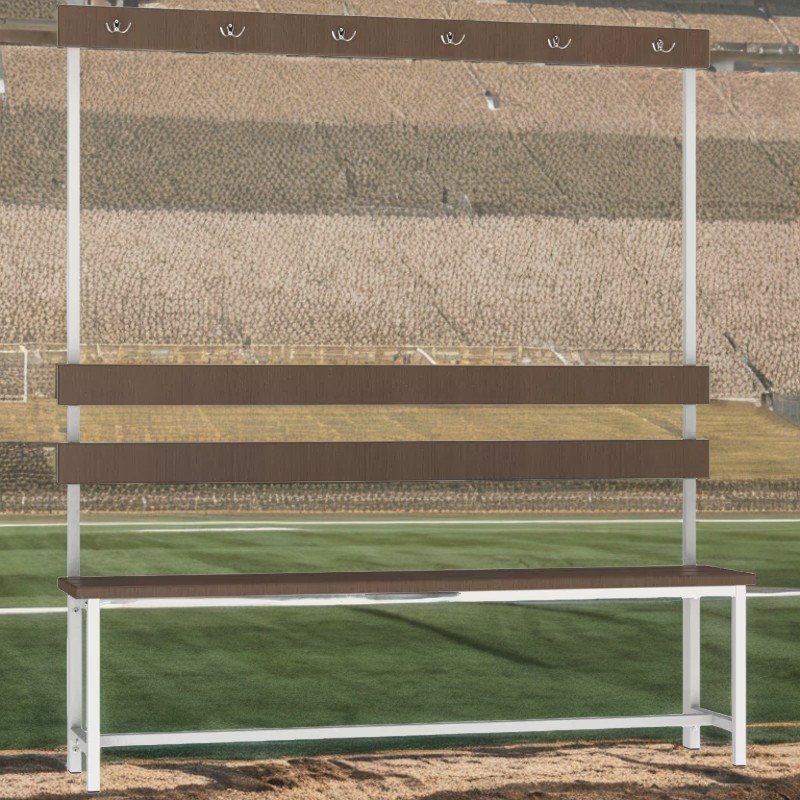 Тази двойна пейка със закачалки от двете страни е идеална за съблекални, фитнес зали или други зони с голям трафик. Конструкцията е разделена на два компонента: долна част със седалка и облегалка от здрави дървени пръти и горна част – двустранна закачалка с множество метални кукички.