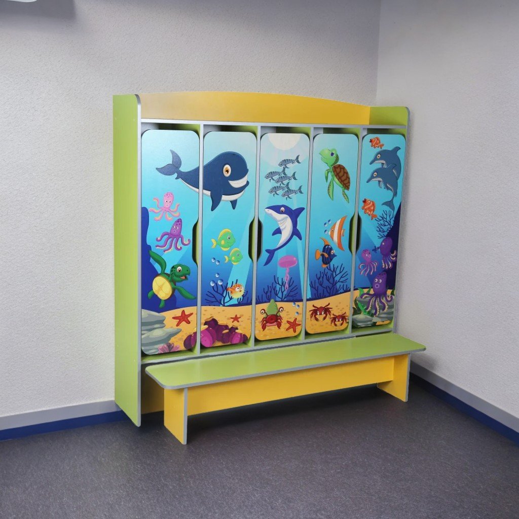 Гардероб с 5 отделни отделения и разтегателна пейка, идеален за детски градини. Изработена от 16 mm меламиново ПДЧ, с 3 mm меламинова PFL гръб. Фасадата е завършена със сребрист ABS кант 1 мм, а вътрешните компоненти с кант 0,5 мм, също в сребрист нюанс. Вратите със заоблени ъгли са декорирани с тематичен фотопечат - морски животни, водоустойчив. Всяко отделение включва два рафта (отгоре/отдолу) и две хромирани куки. Пейката има заоблени ъгли за допълнителна безопасност. Шкафът се монтира към стената и е оборудван с издръжливи пластмасови уплътнения и сигурни крепежни елементи.