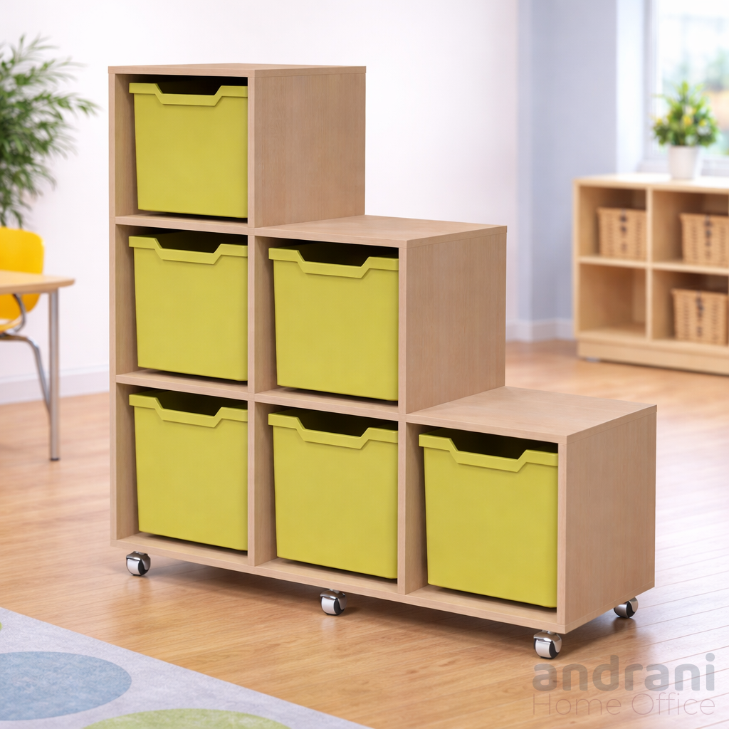 Тази етажерка с 6 пластмасови тави е отлично решение за организирано съхранение в детски градини, училища, занимални и детски стаи. С размери 1200 x 400 x 900 мм, тя предлага практично и удобно пространство за подреждане на играчки, учебни материали, книги и лични вещи.