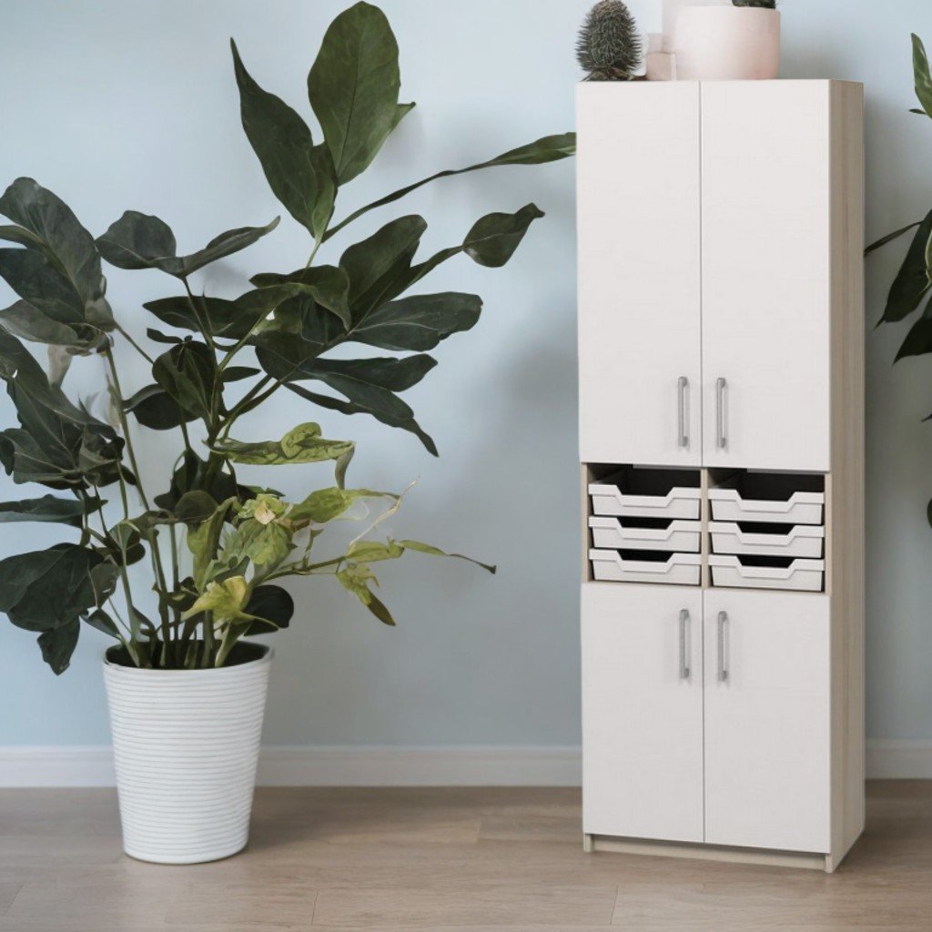 Размери: 702×405×2115 мм. Затворен шкаф от меламиново ПДЧ с дебелина 18 мм. Задната стена е от HDF с дебелина 2,5 мм. Конфигурацията включва 5 отворени рафта с индивидуално регулиране на височината и място за монтаж на 6 пластмасови кутии за съхранение (собствено производство), сив цвят. Всички компоненти са сглобени със специален и безопасен обков, предвиден за закрепване към стената. Шкафът е оборудван с с регулируема височина и на височина метални опори (0–30 mm), идеални за неравни подове. Калъфът е завършен в занаятчийски перлен нюанс, 0,5 mm ABS кант. Фасадите са светло сиви, завършени с ABS кант 1 мм.