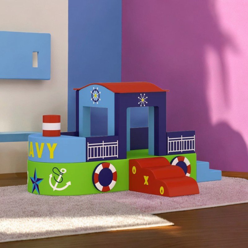 Този мек модул за игра, вдъхновен от формата на кораб, предлага пространство, пълно със забавление и изследване за най-малките. С множество нива, практично стълбище и отвори, специално проектирани за игра, той е идеален за детски стаи, стаи за игра и семейни центрове за отдих.