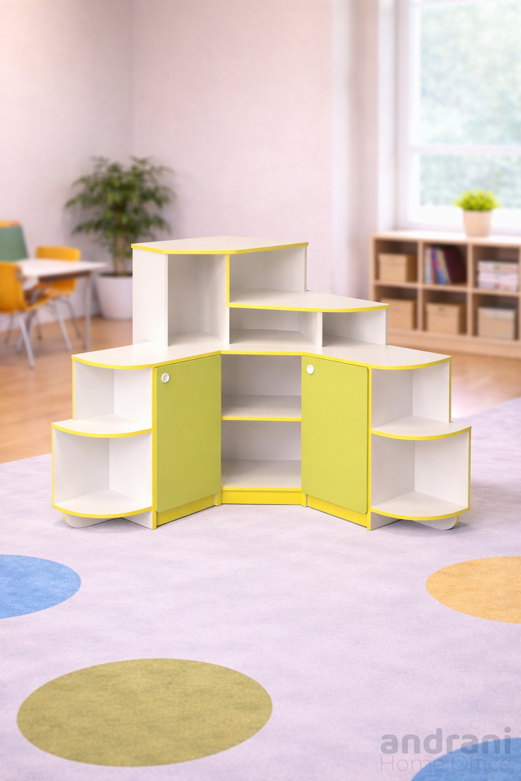 Размери: 1300 х 1300 х 1190 мм Ъглов шкаф изработен от 16 мм меламиново ПДЧ, емисионен клас Е1, с чела, обработени с 0,5 и 1 мм ABS кант в жълт цвят. Включва отворени рафтове за излагане на растения и затворени рафтове за съхранение на инструменти за грижа. Всички ъгли са заоблени за максимална безопасност. Шкафът е снабден с издръжливи пластмасови уплътнения, закрепен е към стената и се сглобява със сигурни крепежни елементи. Налични цветове: жълто/светло зелено жълто/червено червено/синьо жълто/зелено