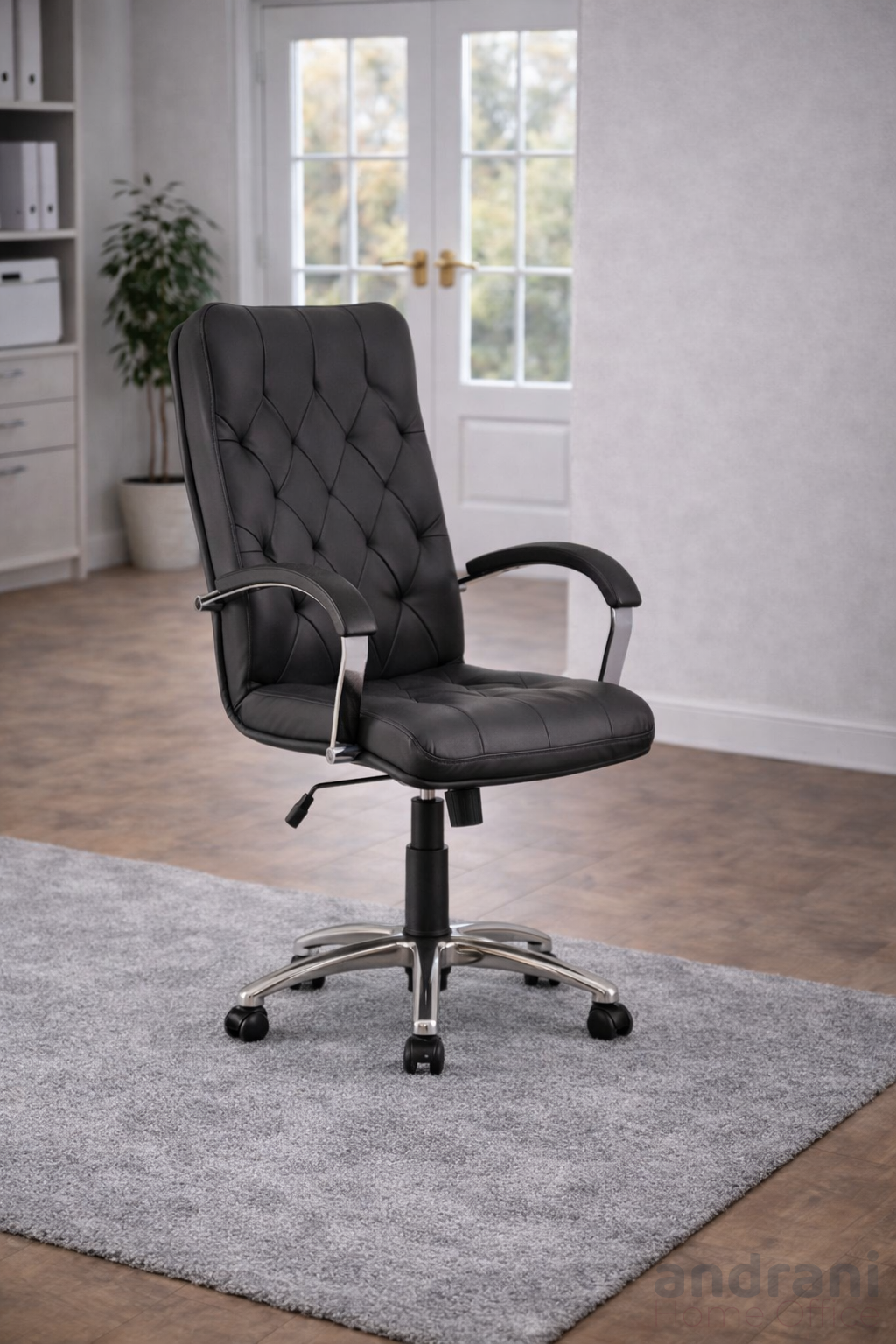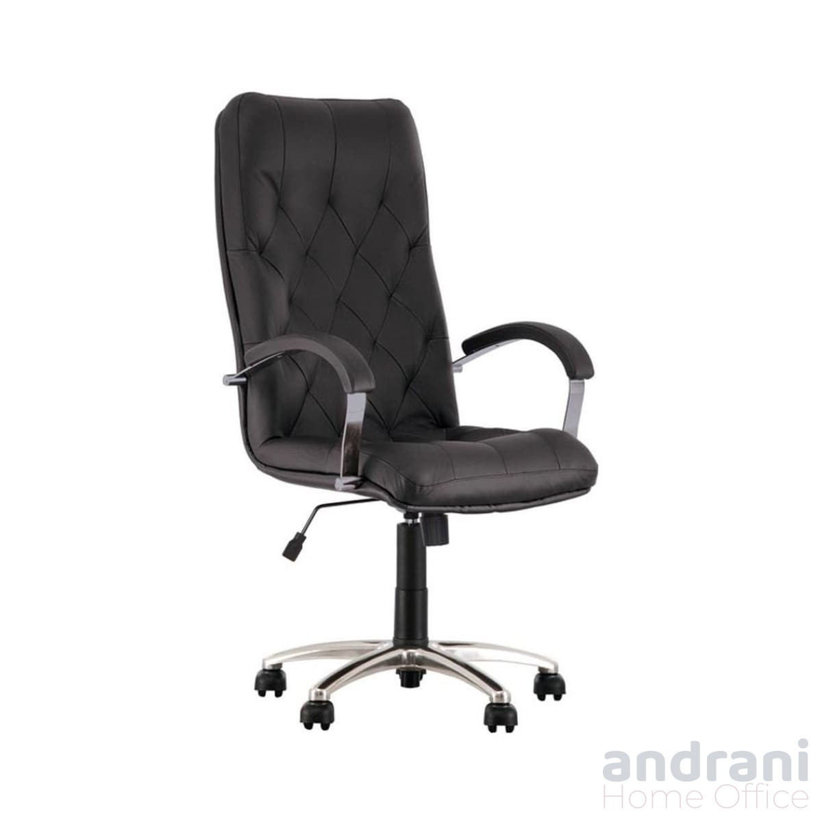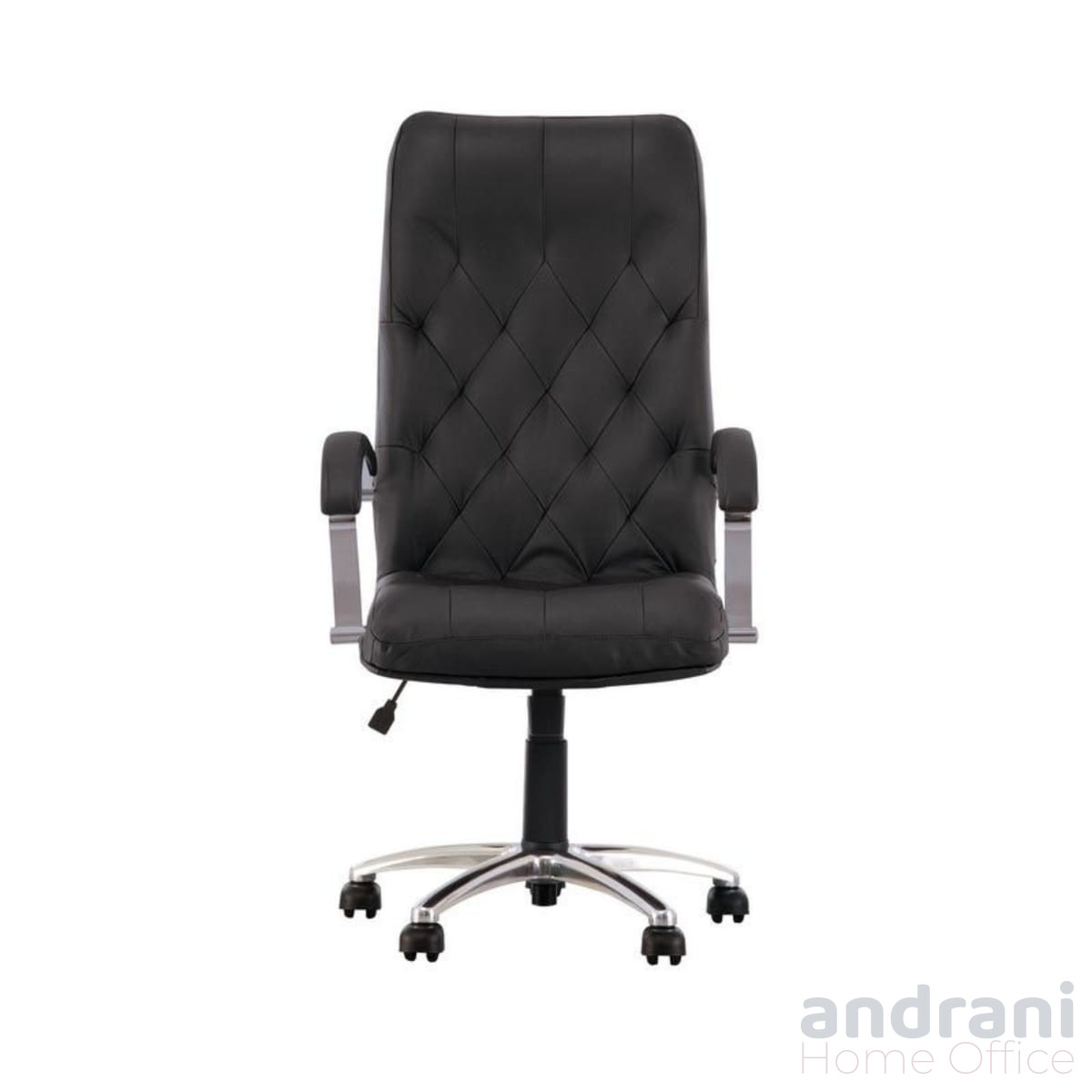 Конструкцията включва здрава кръстовидна основа с ролки, която осигурява стабилност и лесно придвижване. Хромираната основа придава модерен и елегантен завършек на дизайна.