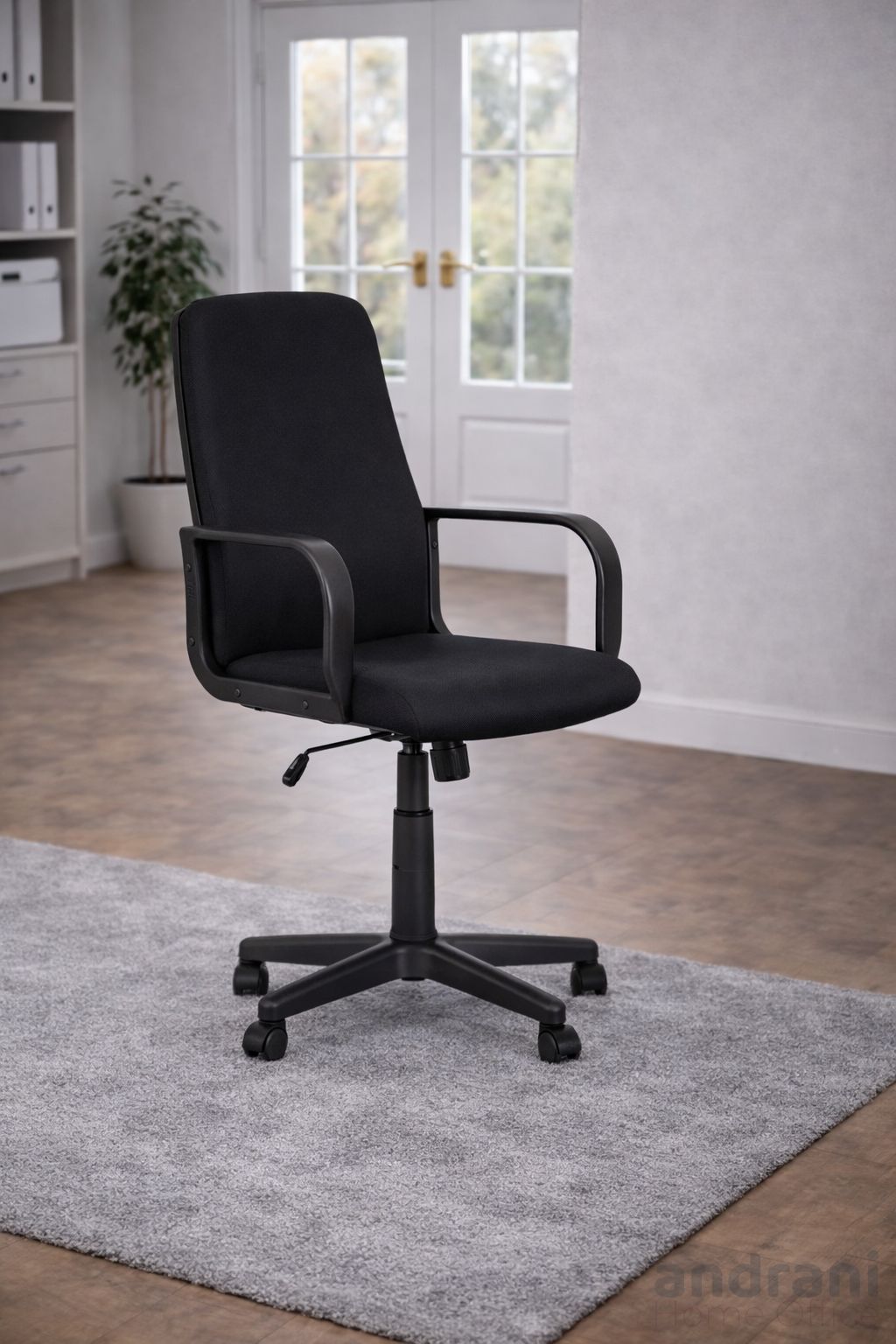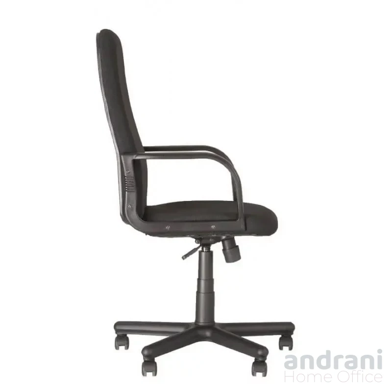 Седалката и облегалката са меки и комфортни, тапицирани с черна текстилна материя, която придава елегантен и професионален вид. Материята осигурява приятна повърхност за седене и добра издръжливост при продължително използване.