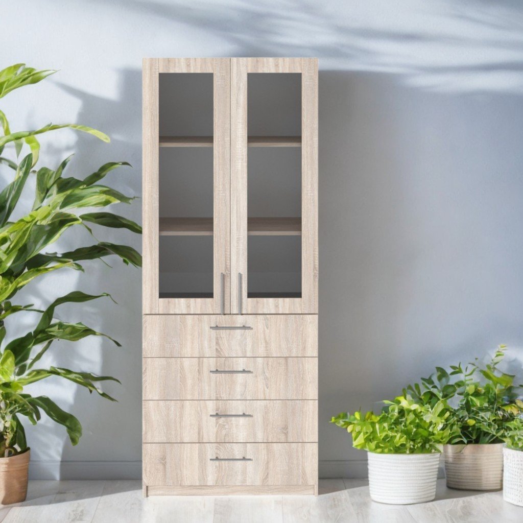 Размери (Д×Ш×В): 800×400×2000 мм. Шкаф изработен от меламиново ПДЧ с дебелина 18 мм. Фасадата е завършена с ABS кант 1 мм, а вътрешните части с кант 0,5 мм. Гърбът е изработен от бял меламин PFL с дебелина 3 мм. Шкафът разполага с 2 видими рафта в горната част със стъклени врати, рамкирани в рамката, а в долната част две ПДЧ врати със затворени рафтове. Снабдена е с хромирани дръжки и позволява регулиране на разстоянието между рафтовете. Частите се сглобяват със специални и сигурни крепежни елементи. Налични цветове: дъб сонома, бял ясен.