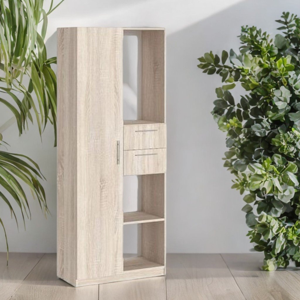 Размери (Д×Ш×В): 800×400×2000 мм. Шкаф изработен от меламиново ПДЧ с дебелина 18 мм. Фасадата е завършена с ABS кант 1 мм, а вътрешните части с кант 0,5 мм. Гърбът е изработен от бял меламин PFL с дебелина 3 мм. Шкафът съдържа 4 рафта от затворен тип с врати и отворена ниша в долната част. Оборудван е с хромирани дръжки, а частите са сглобени със специални и сигурни крепежни елементи. Налични цветове: бял ясен, дъб сонома.