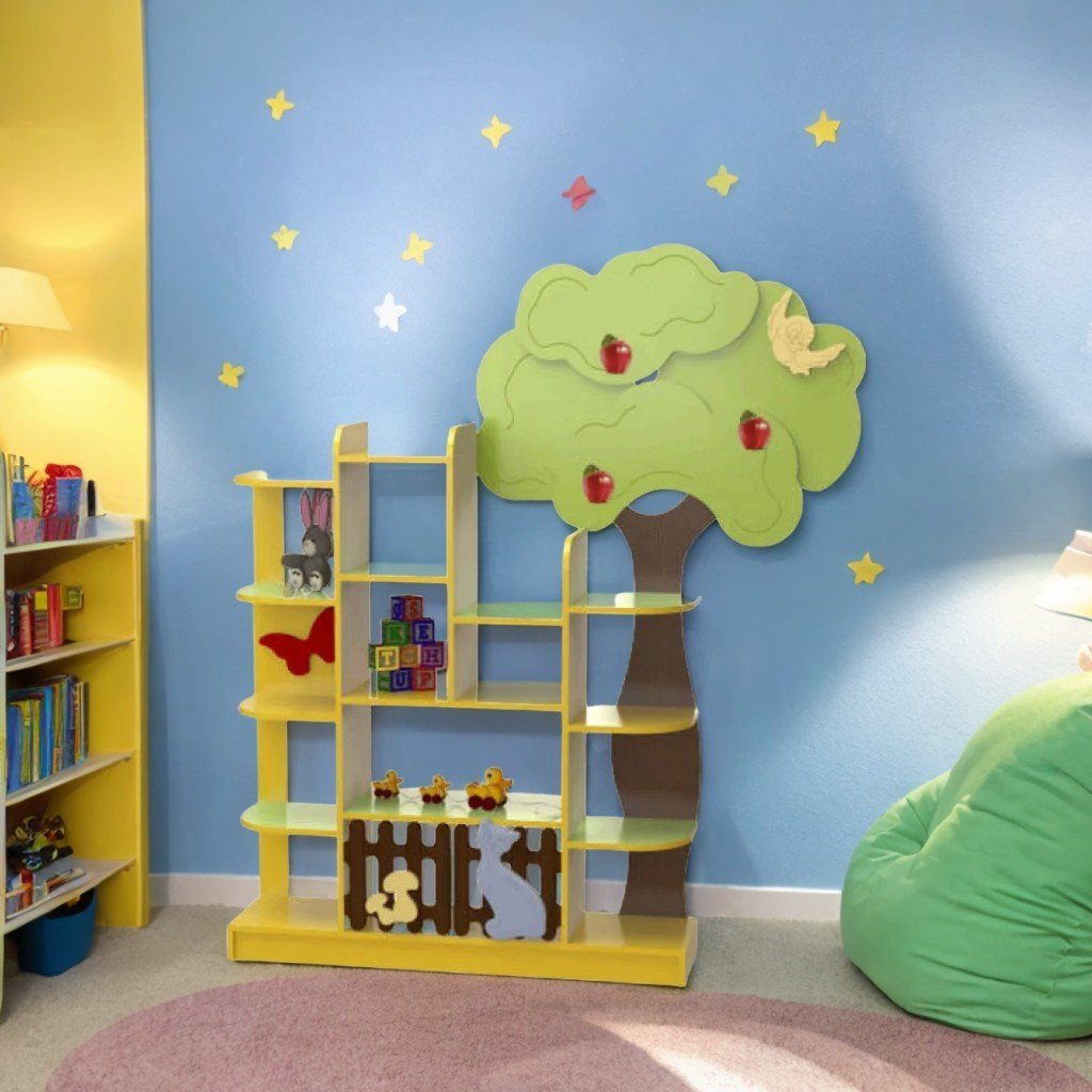 Продуктът разполага с 16 отворени рафта и MDF фасади с резбовани декорации с мотиви, вдъхновени от природата — птици, ябълки, дървета и котки — които придават допълнителен чар и индивидуалност на мебелите.