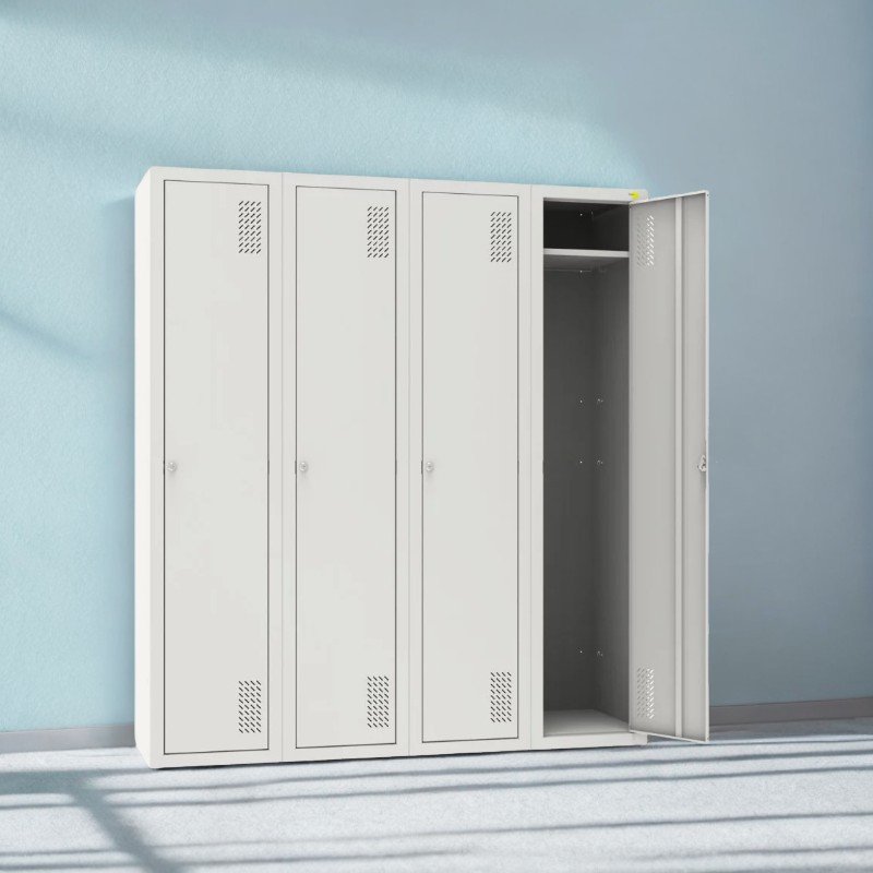 Всяко отделение е снабдено с индивидуално цилиндрично затваряне, което гарантира сигурност и поверителност. Вратите се отварят на 90°, осигурявайки лесен и удобен достъп и са оборудвани с вентилационни отвори в горната и долната част за оптимална вентилация.