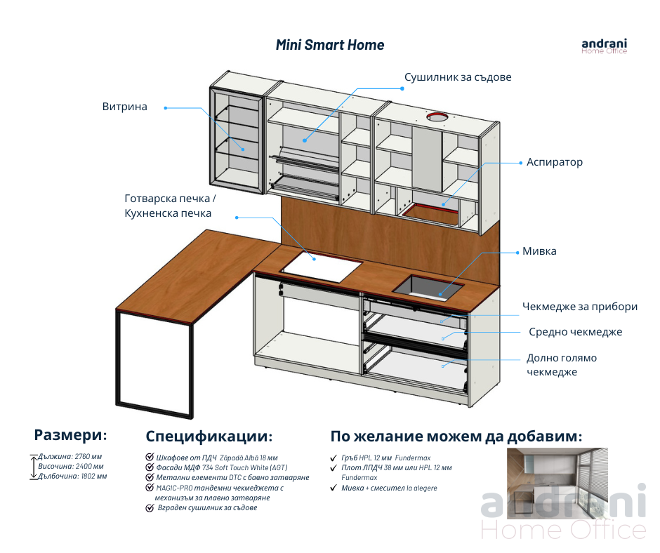 Наличността, цената и характеристиките на серията кухни MINI SMART HOME трябва да бъдат потвърдени от консултантите на Andrani Home Office.