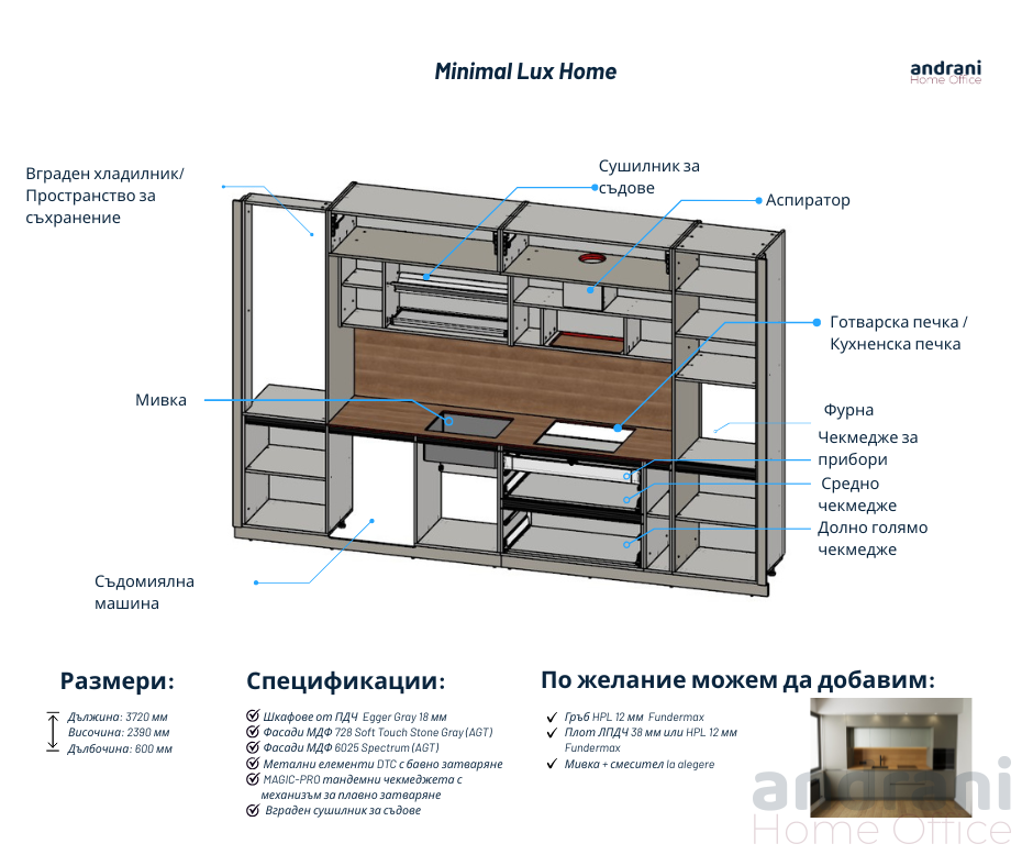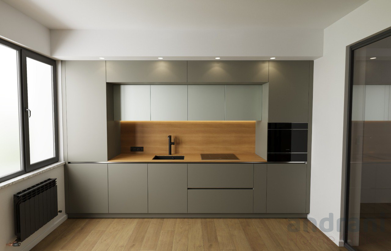 Кухнята Minimal Lux Home е предназначена за тези, които ценят елегантния дизайн, изчистените линии и модерната функционалност. Комбинацията от матови сиви нюанси, акценти Spectrum и минималистични линии предлага съвременен, изтънчен вид, който лесно се интегрира във всеки дом. Това е просторна, балансирана и практична кухня, която предлага както първокласна естетика, така и дълготрайна издръжливост.