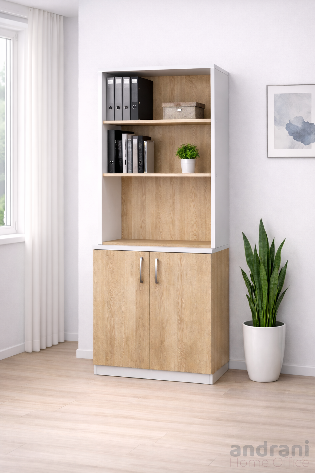 Тази етажерка с рафтове и две врати е функционално решение за съхранение и подреждане както в офис, така и в дневна или хол. Практичното вътрешно пространство позволява удобно организиране на документи, книги, папки и офис материали, като същевременно предпазва съдържанието от прах.