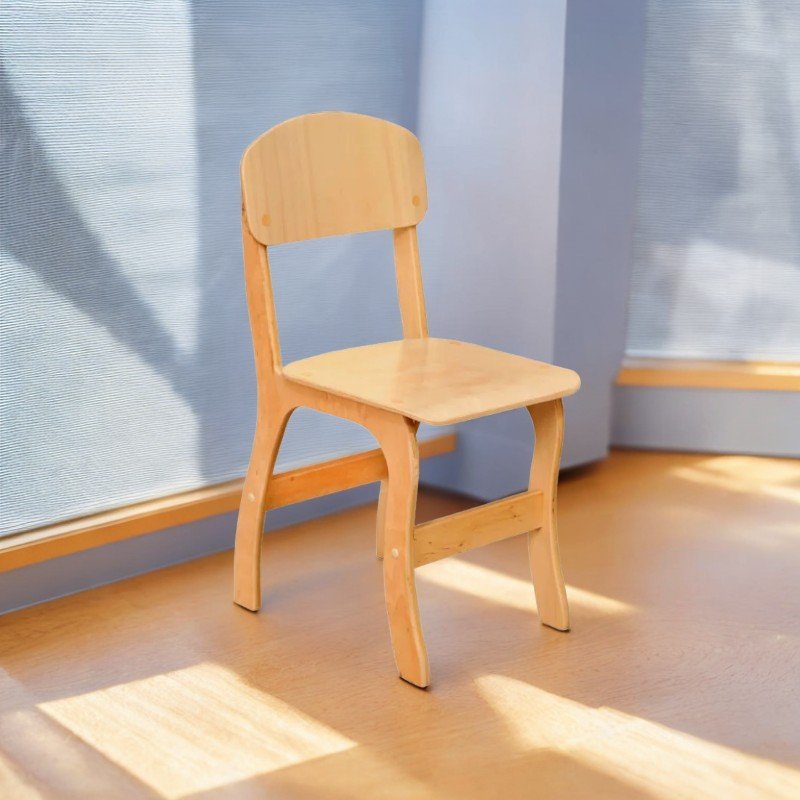 Облегалката и седалката са изработени от лакиран шперплат, леко извит, с дебелина 8 мм. Краката са изработени от 15 мм полиран шперплат. Целият стол е покрит с нетоксичен акрилен лак на водна основа. Заоблените ръбове гарантират безопасността на децата и предотвратяват инциденти. Използваните материали са безопасни, без вредни химикали. Всички компоненти са сглобени със скрит хардуер, гарантиращ солиден и безопасен дизайн.
