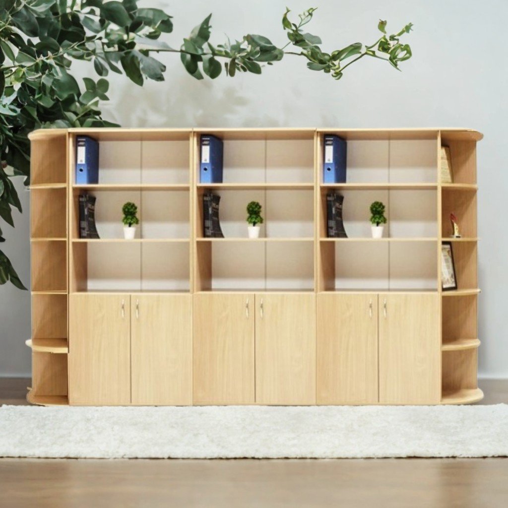 Размери (Д×Ш×В): 3212×403×1816 мм. Комплект мебели от меламиново ПДЧ с дебелина 18 мм. Фасадите са завършени с ABS кант 1 мм, а вътрешните части с кант 0,5 мм. Гърбът е изработен от бял меламин PFL с дебелина 3 мм. Комплектът съдържа 5 отделения: отделения 1 и 5 имат по 5 рафта със заоблени ъгли; отделения 2, 3 и 4 са снабдени с 3 ниши и 3 затворени рафта. Мебелите са оборудвани с хромирани дръжки и с регулируема височина и пластмасови крачета. Шкафовете са закрепени заедно с дървени дюбели. Монтажът се извършва със специални и безопасни крепежни елементи. Налични цветове: бук, светъл дъб.