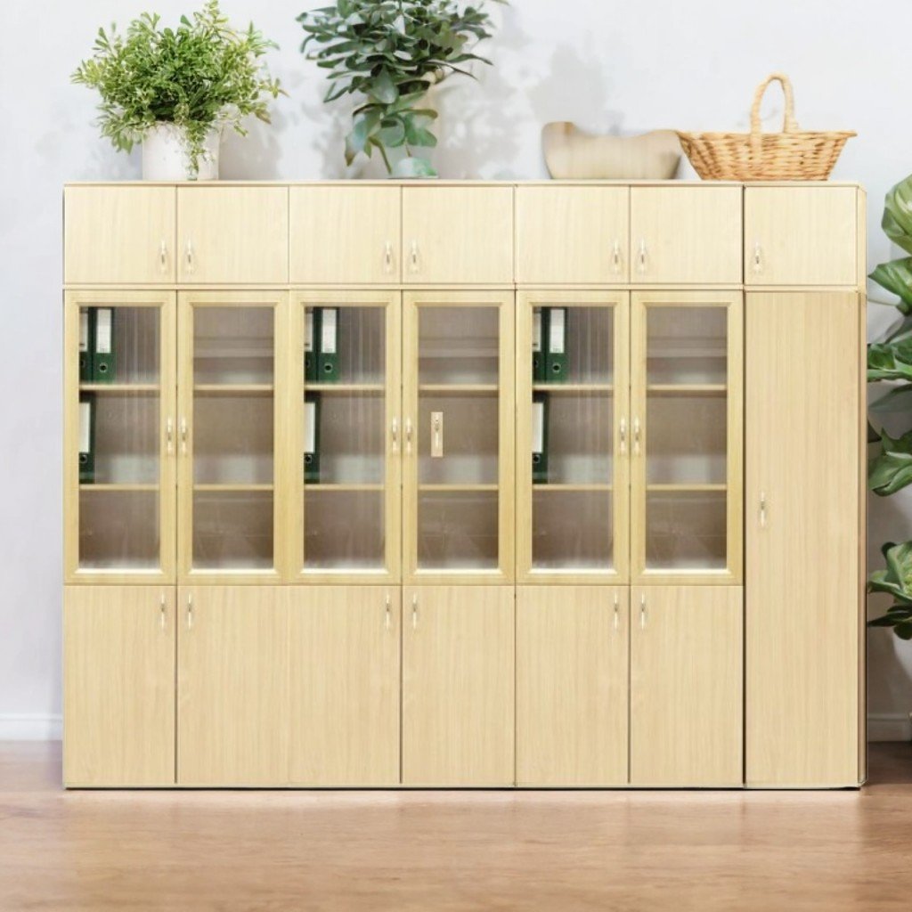 Размери (Д×Ш×В): 2808×403×2186 мм. Мебелен комплект от меламиново ПДЧ 18мм, с лицева облицовка с ABS кант 1мм и вътрешност с ABS кант 0,5мм. Гърбът е изработен от 3 мм бял меламин PFL. Комплектът съдържа 4 отделения: 1, 2, 3 – всяко с 3 видими рафта със стъклени врати, 2 затворени рафта и стенен шкаф; 4 – с рафт, овална хромирана лента за закачалки и стенен шкаф. Шкафовете са свързани с дървени дюбели, имат хромирани дръжки и с регулируема височина и пластмасови крачета. Монтаж със специални и сигурни крепежни елементи. Цветове: бук, светъл дъб.