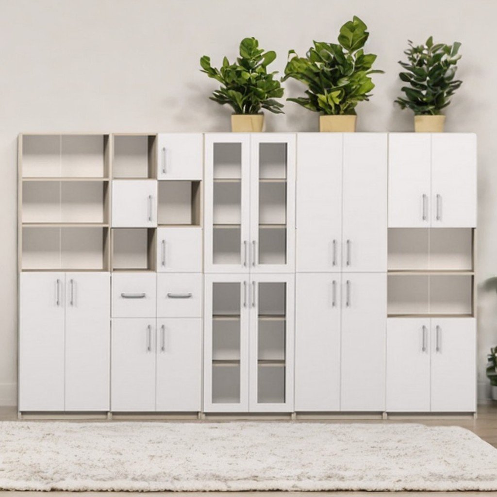 Размери (Д×Ш×В): 3510×405×2115 mm. Комплект мебели от меламиново ПДЧ 18 мм. Калъфът е с цвят на занаятчийска перла, завършен с 0,5 мм ABS кант; фасадите са светло сиви, обработени с ABS кант 1 мм. Гърбът е изработен от 2,5 мм бял меламин PFL. Комплектът се състои от 5 отделения: (1) Полузатворен гардероб с 2 врати – 3 затворени и 3 отворени рафта, с с регулируема височина и рафтове; (2) Комбиниран гардероб с 5 врати – 5 затворени, 3 отворени рафта, 2 чекмеджета на телескопични водачи с пълно изтегляне, с един с регулируема височина рафт; (3) Шкаф с 4 стъклени врати – 6 затворени рафта с с регулируема височина и рафтове, 4 мм прозрачни стъклени врати; (4) гардероб с 4 врати – 6 затворени рафта с с регулируема височина и рафтове; (5) Полузатворен гардероб с 4 врати – 4 затворени и 2 отворени рафта с с регулируема височина и рафтове. Частите се сглобяват със сигурни крепежни елементи, предвидени за стенен монтаж. Шкафовете са оборудвани с пластмасови крака. Цвят: занаятчийска перла, светло сиво. Гаранция: 24 месеца.