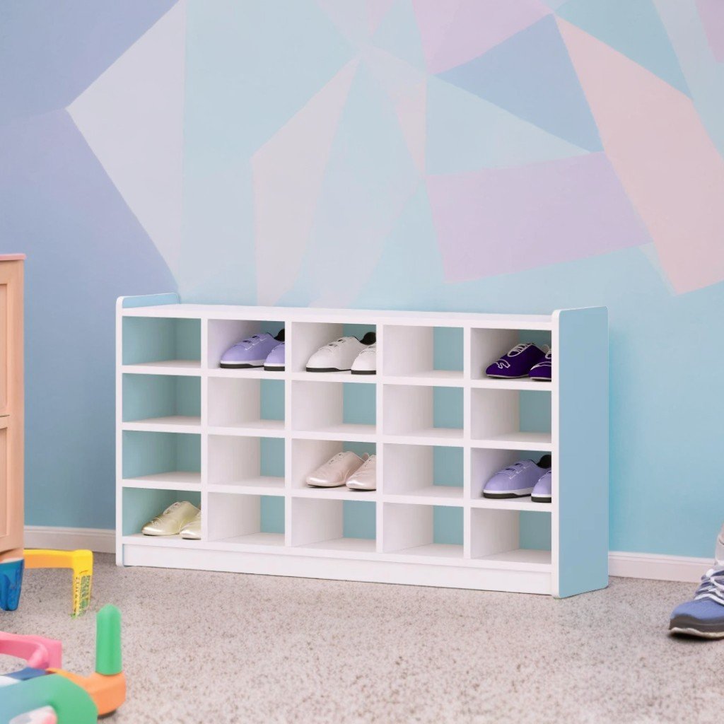 Практичен и издръжлив рафт за съхранение на обувки, изработен от 18 мм ПДЧ. Конструкцията включва 4 нива с 20 отворени секции, идеални за използване в образователни или колективни пространства. Всички компоненти са свързани със специален и безопасен обков. Рафтът е оборудван с издръжливи пластмасови крака. Размери: 1200 х 250 х 650 мм Налични цветове: бяло/жълто, бяло/синьо Гаранция: 24 месеца